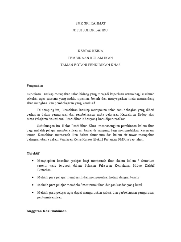 1 Penyediaan biji benih 2 Semaian Anak Benih 3 Membuat Larutan Stok 4 Penyediaan Beg Tanaman 5 Penanaman 6 Pembajaan 7 Pengurusan Sistem Pengairan 8 Kawalan serangga perosak dan penyakit 9 Penyelenggaraan tanaman 10Penuaian 11Pengendalian Lepas Tuai. Di situ anda boleh pilih beberapa kertas kerja perniagaan yang sudah disediakan yang boleh di-edit berdasarkan keperluan anda sendiri. SMK SRI RAHMAT 81200 JOHOR BAHRU KERTAS KERJA PEMBINAAN KOLAM IKAN TAMAN BOTANI PENDIDIKAN KHAS Pengenalan Keceriaan lanskap merupakan salah bidang yang menjadi keperluan utama bagi sesebuah sekolah agar suasana yang indah nyaman bersih dan menyegarkan mata memandang akan menghasilkan pembelajaran yang kondusif.